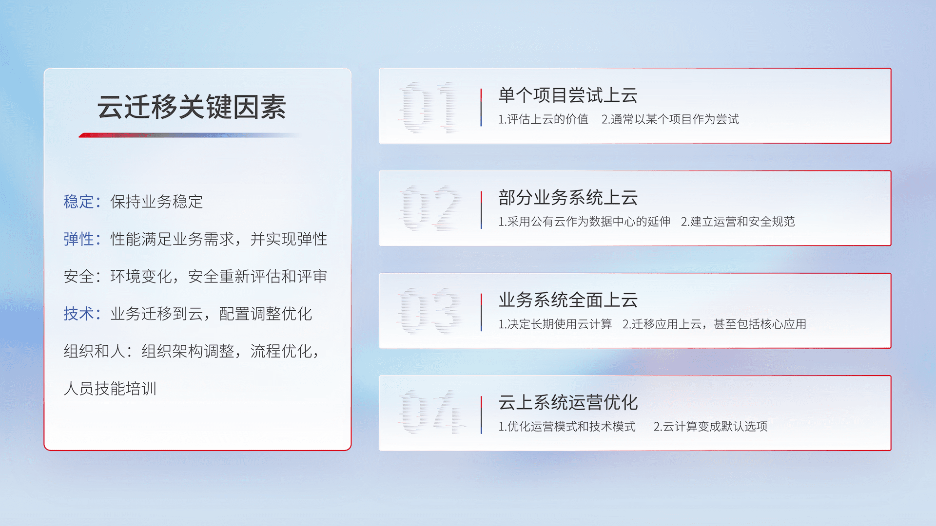 结合实际业务,,,,从规划设计、、云平台选型、、、、云原生改造、、、数据迁移、、集成交付,,,,迁移全过程为客户识别最佳上云路径,,,,做好风险识别管理,,设计网络架构、、、、身份权限、、、、安全审计合规、、、操作审计、、日志审计、、、、监控告警策略、、多站点容灾设计等,,,,对云上基础设施进行整体规划,,,提升IT治理水平,,以满足弹性、、高可用、、、高性能的需求。。。