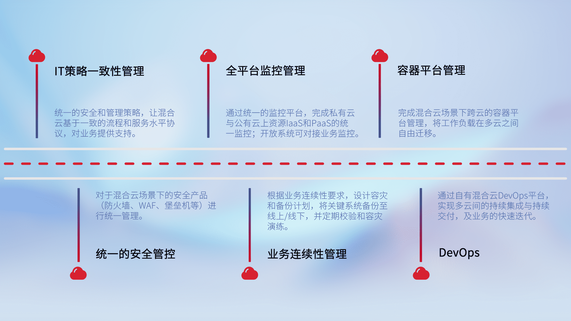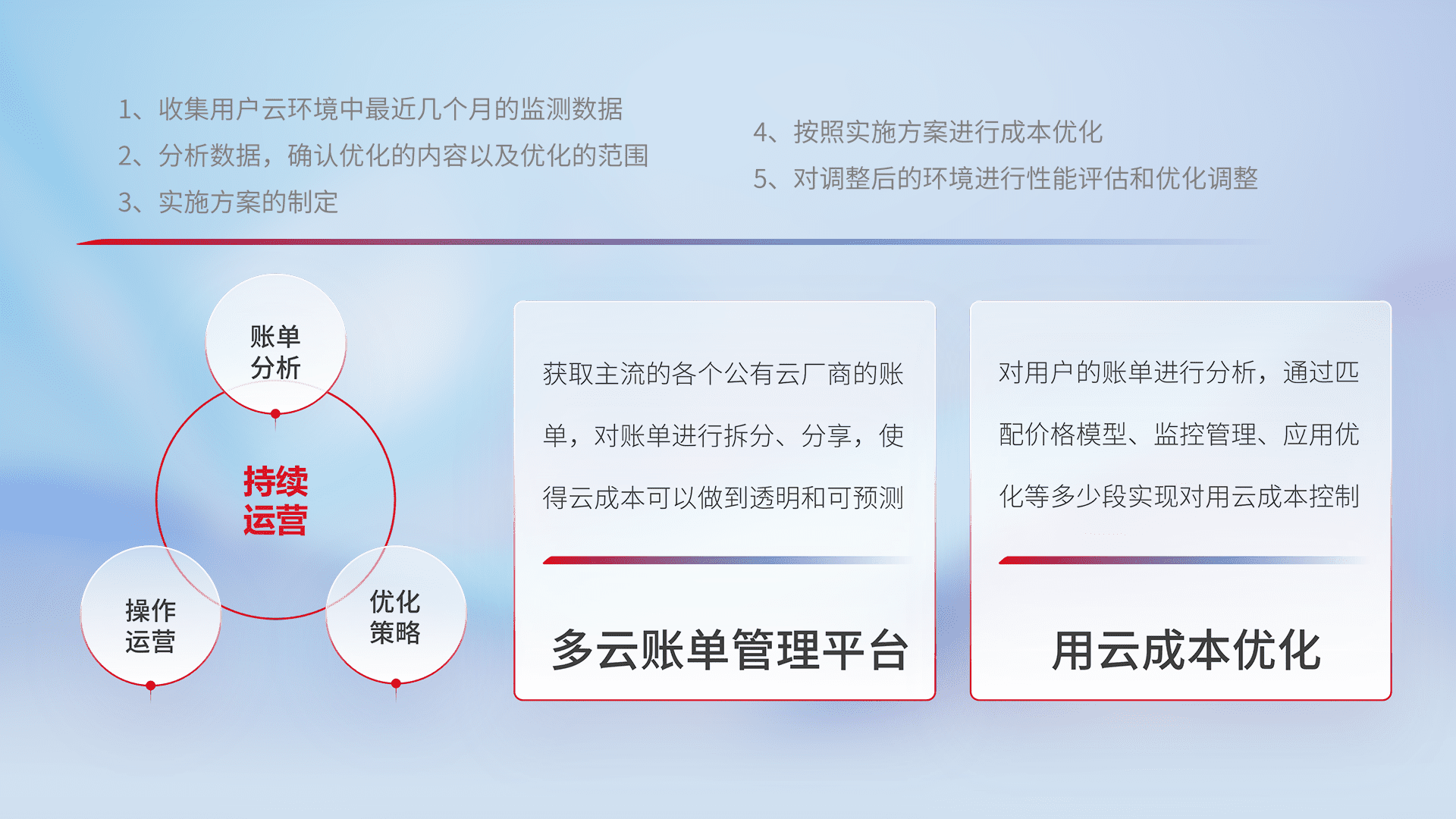 通过多云纳管,,,,以统一的资源数据模型把客户的云资源进行抽象和封装,,,进而实现对多云资源的统一操作,,,保障云资源管理的可靠性、、、稳定性与可用性。。。。量身定制化运维内容,,,配置、、开发运维、、、补丁管理、、、备份、、监控、、、、认证和访问管理、、审计和日常巡检等,,,保障在用云过程中的可靠度,,稳定度以及高可用率。。。